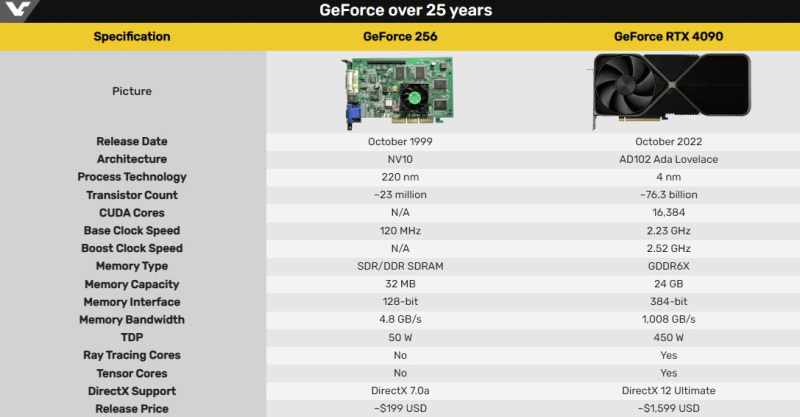 A GPU NV10 na GeForce 256 tinha apenas 23 milhões de transistores – um número minúsculo comparado aos 76,3 bilhões de transistores que estão presentes na atual GPU AD102, que serve de base para a placa de vídeo GeForce RTX 4090. A memória de vídeo GeForce 256. tinha apenas 32 MB, o que contrasta fortemente com os 24 GB de memória (768 vezes mais) que o RTX 4090 possui hoje.
