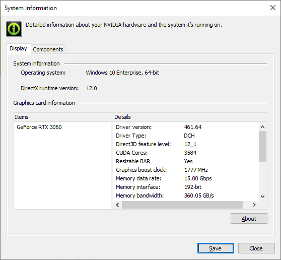 Depois de instalar todas as atualizações necessárias e o driver NVIDIA Game Ready 461.72 WHQL mais recente, você pode verificar se há suporte para BAR redimensionável no Painel de controle NVIDIA. Para isso, selecione o item “Informações do sistema” e localize a linha “BARRA redimensionável” marcada “Sim”.