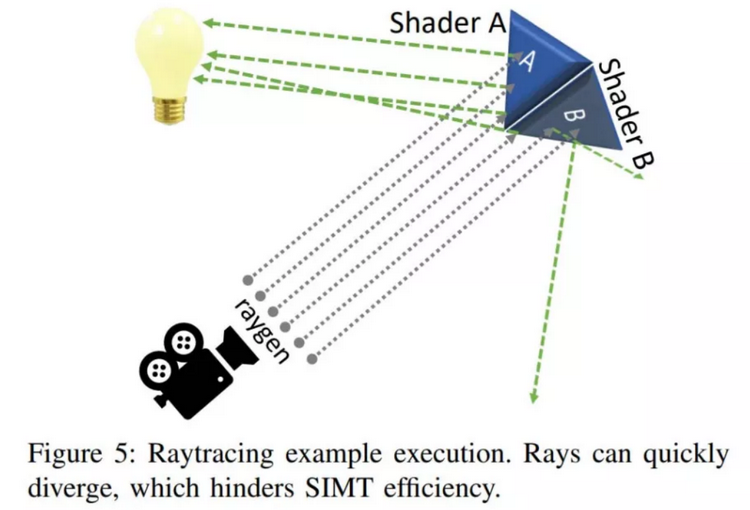 O artigo afirma que uma das deficiências mais importantes das placas de vídeo modernas é a distribuição desigual de carga ao processar tarefas relacionadas ao rastreamento de raios. As GPUs agrupam threads em pools (na terminologia NVIDIA – “warp”) com base em um único contador de comandos, e o processamento é realizado de acordo com o princípio SIMT (Single Instruction, Multiple Threads – uma instrução, muitos threads). Em cenários clássicos de processamento gráfico, essa é a abordagem mais eficiente, mas no ray tracing ela leva a um tempo de inatividade parcial da GPU devido à distribuição de carga desigual.
