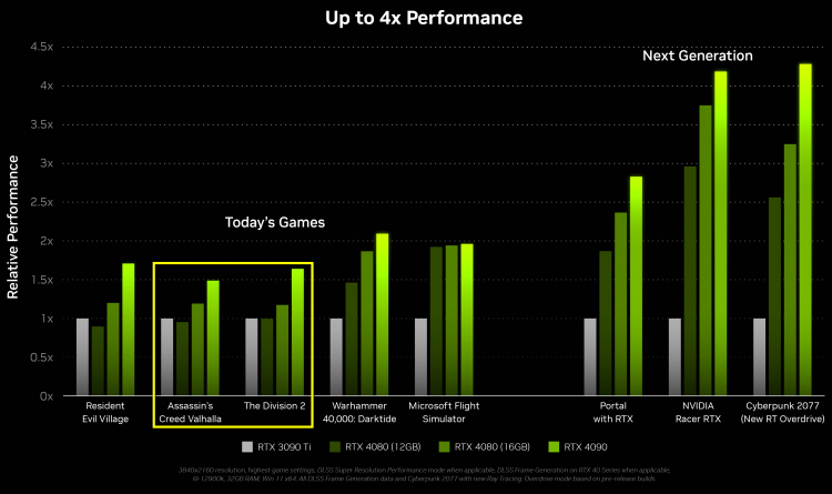 Durante a apresentação das placas de vídeo GeForce RTX série 40, a NVIDIA afirmou que os novos produtos são até 2-4 vezes mais rápidos que seus antecessores em termos de velocidade. Os usuários estavam céticos sobre isso, porque geralmente o aumento de geração para geração é de 30 a 50%. A NVIDIA declarou o seguinte nesta ocasião: “O RTX 4090 oferece um aumento de desempenho de até 2-4 vezes por meio de uma combinação de melhorias de software e hardware”.