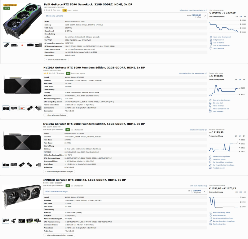 Citando o agregador de preços alemão Geizhals, o PCGH escreve que o custo das placas GeForce RTX 5000 nas lojas agora está significativamente mais alto do que o recomendado. Assim, o modelo principal GeForce RTX 5090 Founders Edition é oferecido ao preço de 4.988 euros. As versões personalizadas da RTX 5090 começam em € 2.999, enquanto as RTX 5080 de referência e personalizadas começam em € 2.119 e € 1.399, respectivamente. A RTX 5070 Ti em versões personalizadas começa em € 969, a RTX 5070 FE de referência ainda não está disponível para venda devido a um atraso na produção, e versões personalizadas desta placa são oferecidas a partir de € 649.