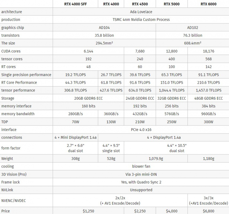 Todas as placas apresentadas suportam 16 pistas da interface PCIe 4.0. Os modelos mais antigos receberam quatro saídas de vídeo DisplayPort 1.4a. O RTX 4000 Ada possui quatro conectores mini-DisplayPort 1.4a.