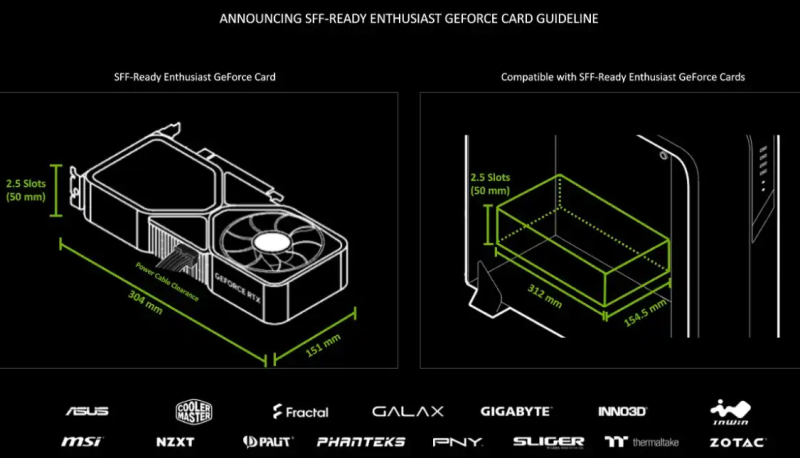 Hoje, a Nvidia anunciou o lançamento de uma iniciativa chamada SFF-Ready Enthusiast GeForce Card como parte de sua apresentação na Computex 2024. Com sua ajuda, a empresa espera eliminar a confusão entre os consumidores que gostariam de construir um computador potente, mas compacto. A ideia da Nvidia é bastante simples. A empresa apresentou requisitos específicos para o tamanho do próprio acelerador gráfico (levando em consideração uma pequena margem para conexão dos conectores de alimentação), bem como quanto espaço livre deve haver dentro do gabinete para o correto posicionamento e resfriamento da placa de vídeo.