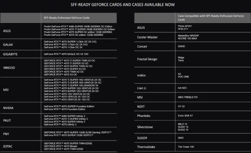A Nvidia preparou uma lista de placas de vídeo e gabinetes que atendem aos requisitos SFF-Ready e podem ser adquiridos agora. A lista inclui gabinetes de alguns dos maiores fabricantes de gabinetes SFF, bem como principalmente placas de vídeo GeForce RTX 4070 e 4070 Ti, embora existam algumas GeForce RTX 4080 lá também. As placas gráficas de baixo custo não entraram na lista porque a iniciativa SFF-Ready é voltada para entusiastas. A placa gráfica SFF-Ready mais poderosa é a impressionantemente fina Asus ProArt RTX 4080 Super.