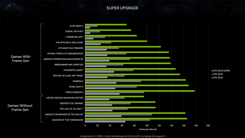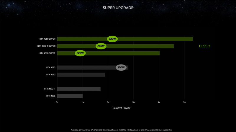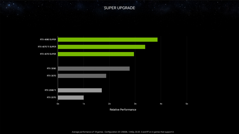 A NVIDIA afirma que, por exemplo, a GeForce RTX 4070 Super é mais rápida que o carro-chefe da geração anterior GeForce RTX 3090. E ao usar a tecnologia de escalonamento de imagem DLSS 3, a diferença de desempenho em favor dos novos modelos Super torna-se ainda maior.