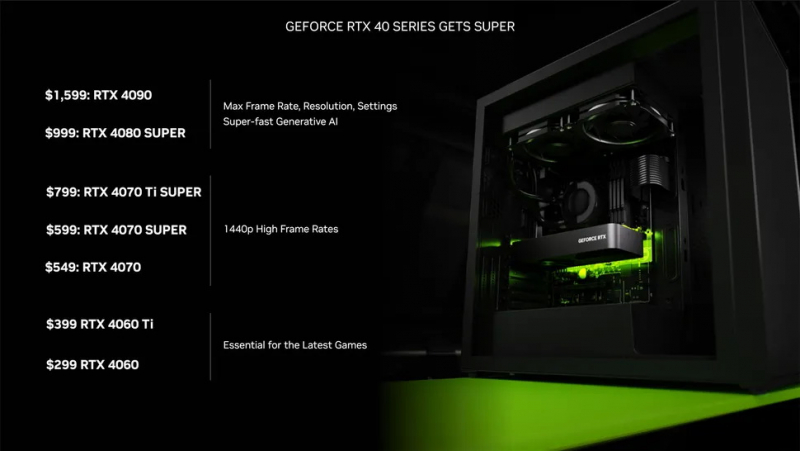 As placas de vídeo GeForce RTX 4080 Super e GeForce RTX 4070 Ti Super substituirão completamente as RTX 4080 e RTX 4070 Ti normais à venda. Ao mesmo tempo, a NVIDIA fixou o preço da GeForce RTX 4080 Super em US$ 999, que é US$ 200 mais barato que o RTX 4080 original. O modelo RTX 4070 Ti Super custa US$ 799 – o mesmo preço do RTX 4070 Ti normal no início das vendas. . Por sua vez, a GeForce RTX 4070 Super será vendida junto com a GeForce RTX 4070 normal. O preço da nova placa é de US$ 599, enquanto para a RTX 4070 normal a empresa reduziu o preço de US$ 599 para US$ 549.