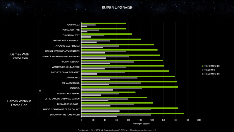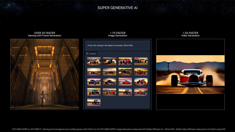 Infelizmente, a NVIDIA não comparou as novas placas Super com os modelos regulares da série GeForce RTX 40. Em vez disso, o fabricante comparou os novos produtos com as placas de vídeo da série GeForce RTX 30 da geração anterior baseadas na arquitetura Ampere, contra a qual os novos produtos obviamente parecem muito mais rápidos. Não apenas em jogos, mas também em tarefas relacionadas à IA.