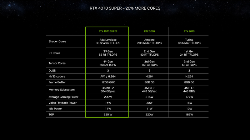 Por fim, o modelo GeForce RTX 4070 Super recebeu um processador gráfico AD104-350 com 7168 núcleos CUDA, que é 1280 a mais que o AD104-250 no RTX 4070 normal. As frequências base e boost da nova GPU são 1980 e 2475 MHz, respectivamente, e RTX 4070 regular – 1920 e 2475 MHz.