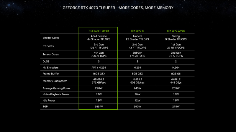 A placa de vídeo GeForce RTX 4070 Ti Super recebeu 16 GB de memória GDDR6X com velocidade de 21 Gbps por pino com suporte para barramento de 256 bits. Isso aumentou seu rendimento para 672 GB/s. Em comparação, o RTX 4070 Ti possui 12 GB de memória GDDR6X com suporte para barramento de 192 bits, 21 Gbps por pino e largura de banda de 504 GB/s. O consumo de energia do novo modelo não mudou e é de 285 W.
