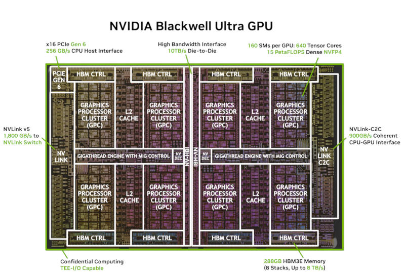 A Nvidia divulgou informações detalhadas sobre o acelerador de IA Blackwell Ultra GB300. Ele difere de seu antecessor, o GB200, por ter um número maior de núcleos e memória, uma interface mais rápida e maior potência. O Nvidia GB300 é baseado em dois cristais com um total de 208 bilhões de transistores — eles são fabricados com a tecnologia TSMC 4NP e operam como um único processador gráfico (GPU) devido à interconexão NV-HBI com uma velocidade de 10 TB/s.