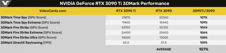 Informações mais detalhadas sobre o desempenho da GeForce RTX 3090 Ti são esperadas com o surgimento das primeiras análises independentes, cuja proibição de publicação termina hoje. Os revisores observam que a NVIDIA não forneceu amostras da versão de referência da placa de vídeo e placas de vídeo de parceiros participam das revisões. O portal VideoCardz compartilhou os números de desempenho da GeForce RTX 3090 Ti no benchmark sintético 3Dmark. Os dados mostram que o novo produto é, em média, apenas 7% mais rápido que a GeForce RTX 3090 comum.
