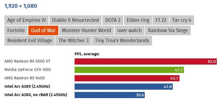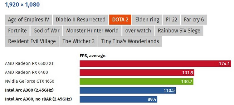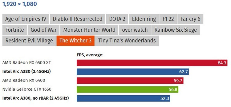 Além disso, sem BAR redimensionável, o FPS cai muito. Em alguns jogos, a tecnologia oferece um aumento de desempenho de até 84%, e você não pode ficar sem ela – o FPS será muito baixo. Acrescentamos imediatamente que o driver Intel não suporta a ativação de BAR redimensionável em sistemas com Ryzen. Além disso, os jogos simplesmente “voam” no PC, onde coexistem gráficos Ryzen e Intel. Portanto, é simplesmente impossível usar a placa de vídeo Arc A380 em sistemas AMD. Com processadores Intel, a situação com travamentos de jogos não é muito melhor. Conforme observado pelos especialistas da Computer Base, apenas no primeiro dia de testes eles tiveram 15 fechamentos de emergência de jogos.