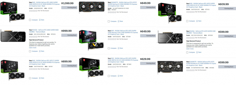 Antes do início das vendas, as principais lojas de varejo ocidentais Newegg e BestBuy anunciaram preços para algumas versões das placas de vídeo GeForce RTX 4070 Super, RTX 4070 Ti Super e RTX 4080 Super.