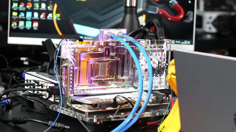 Depois de montar a placa de vídeo, os brasileiros também instalaram nela um water block LSS de alto desempenho. A Teclab também testou a placa utilizando nitrogênio líquido como resfriamento.