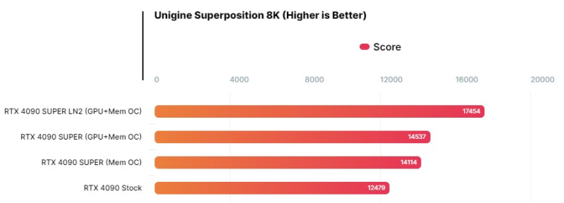 Em estoque, o RTX 4090 modificado tem desempenho semelhante ao RTX 4090 padrão regular. No entanto, devido ao uso de chips de memória mais rápidos (e sem overclocking adicional de GPU), a versão modificada oferece um aumento de 13 por cento no desempenho em comparação com o RTX 4090 normal. no benchmark Unigine Superposition com resolução de 8K. E com overclock adicional da GPU para 3 GHz, a vantagem da GeForce RTX 4090 Super no mesmo teste já é de 16%.
