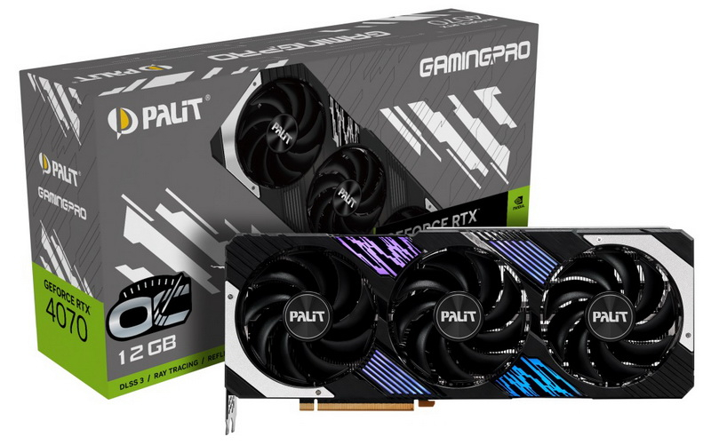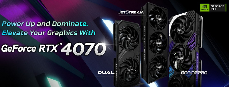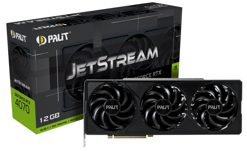 A Palit apresentou os modelos GeForce RTX 4070 GamingPro, JetStream e Dual. Os dois primeiros são equipados com grandes sistemas de resfriamento com três ventiladores e slots de expansão 3.1 de espessura. O modelo Dual recebeu um sistema de refrigeração compacto com dois ventiladores, e a espessura da placa de vídeo é de dois slots de expansão.