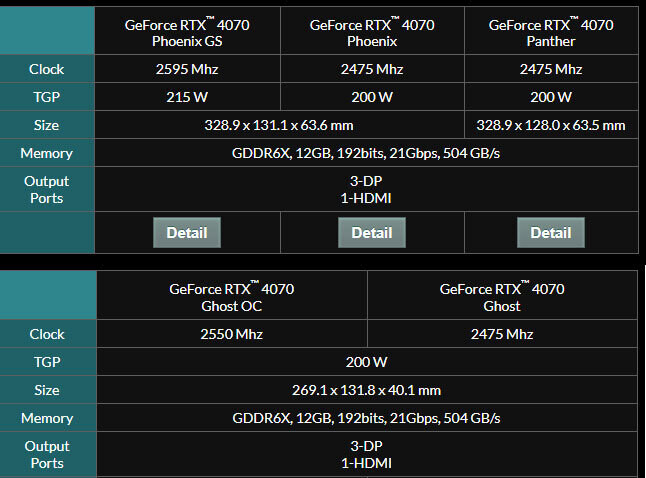 A Gainward apresentou os modelos GeForce RTX 4070 Phoenix, Panther e Ghost. Os modelos Phoenix e Ghost serão lançados com ou sem GPUs com overclock de fábrica. Para a versão Phoenix GS da GPU, a frequência é de 2595 MHz. Para a versão com overclock do Ghost, é indicada uma frequência de 2550 MHz.