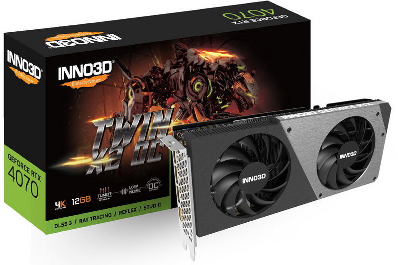 Para a GeForce RTX 4070 Twin X2, a frequência de GPU de referência é de 2475 MHz. Todas as três placas são equipadas com sistemas de resfriamento compactos com dois ventiladores. As dimensões dessas placas gráficas são 250 × 118 × 42 mm.
