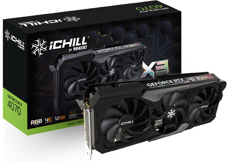 Para a versão GeForce RTX 4070 iChill X3, a frequência da GPU é de 2535 MHz. A placa recebeu um sistema de resfriamento de três slots com três ventoinhas. A placa está equipada com um conector de alimentação 12VHPWR de 12+4 pinos. O fabricante previu a presença na entrega da novidade de um adaptador de dois conectores de 8 pinos para um novo. As dimensões do cartão são 334 × 148 × 62 mm.