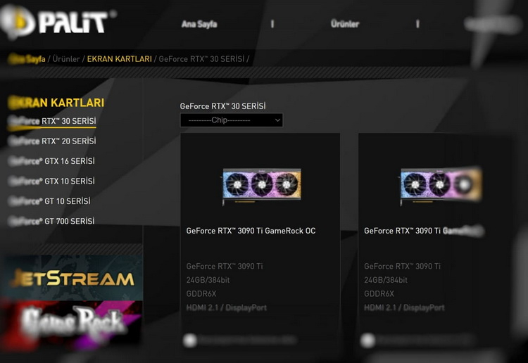 A Palit está prestes a lançar uma placa de vídeo GeForce RTX 3090 Ti da GameRock. Informações sobre isso foram encontradas na versão turca do site do fabricante. Ele logo foi excluído, mas permaneceu no cache do Google, escreve o portal VideoCardz.
