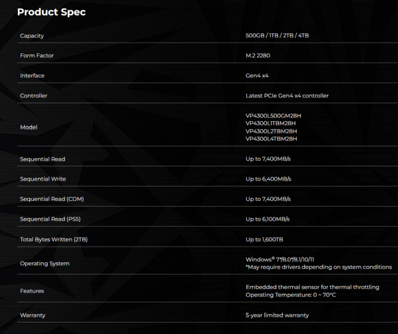 Os novos itens são equipados com um sensor de temperatura embutido e, para resfriamento, usam um dissipador de calor de grafeno fino. Para o SSD da série VP4300 Lite, o fabricante afirma velocidades de leitura sequencial de até 7.400 MB/s e velocidades de gravação sequencial de até 6.400 MB/s. No entanto, as especificações variam de acordo com o modelo e o ambiente de uso. Assim como a série VP4300, os modelos VP4300 Lite também são compatíveis com consoles de jogos PlayStation 5. Nesse caso, são declaradas velocidades de leitura sequencial de até 6100 MB / s.