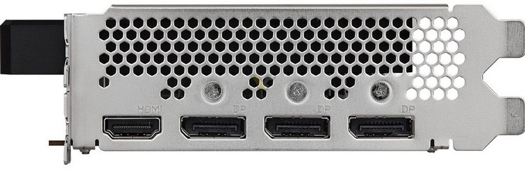 Um conjunto de conectores externos Intel Arc A380 da ASRock é representado por três DisplayPort 2.0 e um HDMI 2.0b.