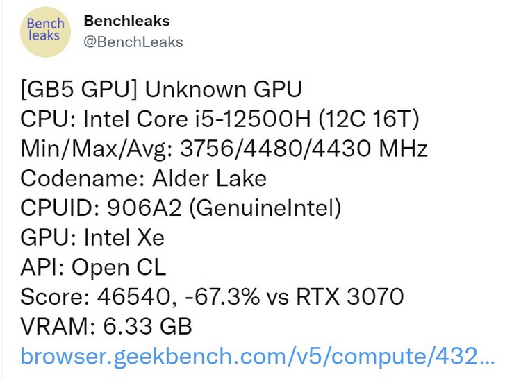 O banco de dados de teste sintético Geekbench 5 revelou o desempenho gráfico de um laptop desconhecido baseado no processador Core i5-12500H, equipado com um processador gráfico discreto da série Intel DG2 Arc Alchemist com 256 unidades de execução e 6 GB de memória de vídeo. Com base nos resultados de duas execuções de teste do benchmark OpenCL, a placa de vídeo Intel demonstrou o desempenho da AMD Radeon RX 580 e NVIDIA GeForce GTX 1650 Super.