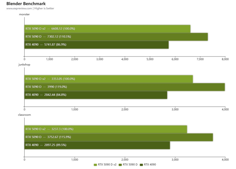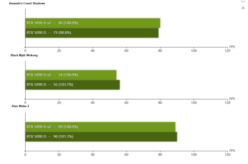 A publicação chinesa Expreview comparou o desempenho das placas de vídeo GeForce RTX 5090D V2 e GeForce RTX 5090D. Ambas foram lançadas especificamente para o mercado chinês e, inicialmente, apresentam desempenho inferior ao modelo original GeForce RTX 5090, lançado para o mercado global.