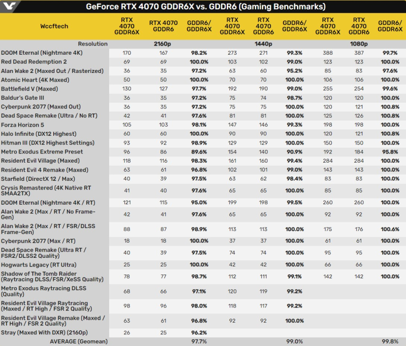 Em média, o RTX 4070 GDDR6 oferece 97,7% do desempenho de jogo do modelo original em 4K, 99% em 1440p e 99,8% em 1080p. Ou seja, quem joga em 1440p ou 1080p pode não notar diferença de desempenho entre as duas placas. Na resolução 4K, que não é a resolução desejada para o RTX 4070, especialmente sem o uso de upscalers ou gerador de quadros, os proprietários do RTX 4070 GDDR6 devem esperar um atraso de 2% em comparação com o RTX 4070 GDDR6X original.