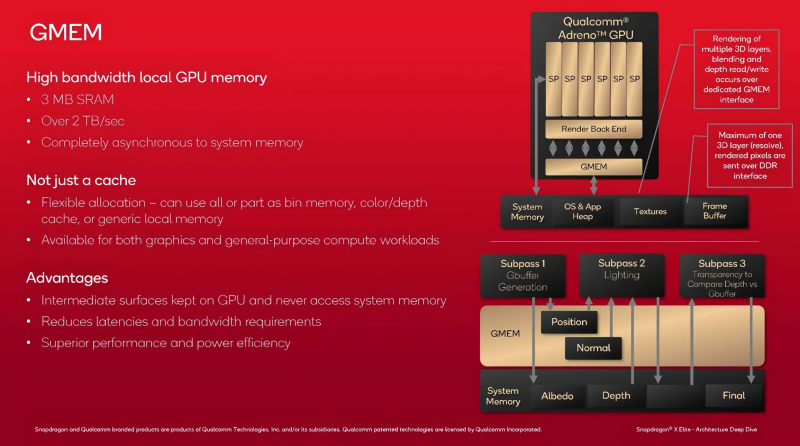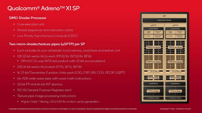 A GPU Adreno X1 contém até seis núcleos, combinando até 1536 ALUs de shader para operações FP32, capazes de processar até 96 texels por ciclo. No auge, a GPU tem 4,6 teraflops de desempenho e pode processar até 72 GT/s (gigatexels por segundo).
