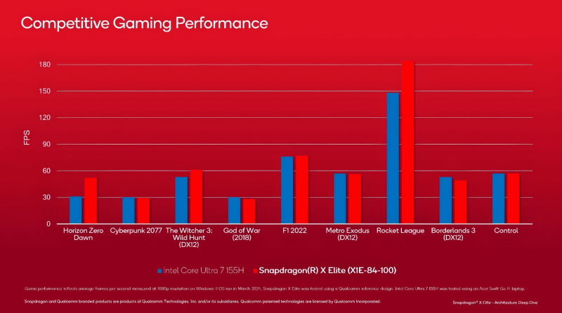 Em sua apresentação, a Qualcomm fornece exemplos de desempenho em jogos para a versão mais antiga da GPU – X1-85 – como parte de seu laptop de referência. A empresa compara os resultados com os gráficos Intel Xe integrados no chip Core Ultra 7 155H com oito núcleos gráficos, que foi usado no laptop Acer Swift Go 14 em quatro dos nove testes de jogos com resolução de 1080p, o acelerador Qualcomm é mais rápido. .
