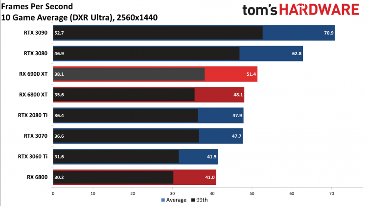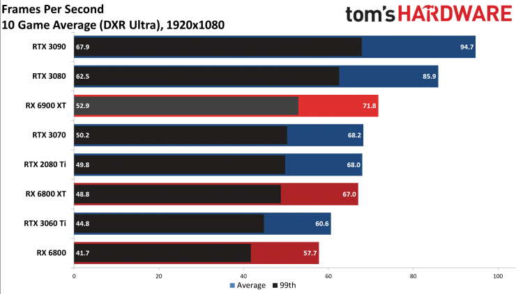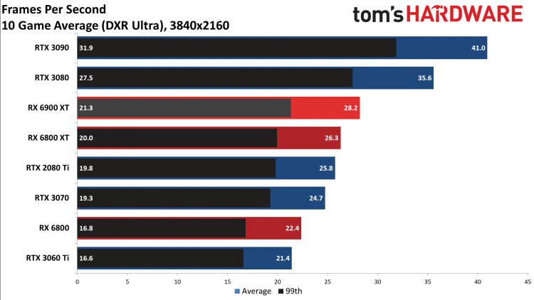 Em jogos com DLSS e tecnologias de rastreamento de raios, o Radeon RX 6900 XT fica muito atrás do GeForce RTX 3090. Os testes foram realizados em títulos de jogos como COD: Black Ops Guerra Fria, Controle, Fortnite, Crysis Remastered, Dirt 5, Metro, Shadow of the Tomb Raider, Watch Dogs Legion e muito mais. Na melhor das hipóteses, a placa de vídeo AMD acabou sendo mais rápida do que os modelos GeForce RTX 2080 Ti e GeForce RTX 3070, mas não conseguiu nem alcançar a GeForce RTX 3080. O resultado médio de desempenho em 10 jogos com as funções acima habilitadas foi o seguinte: