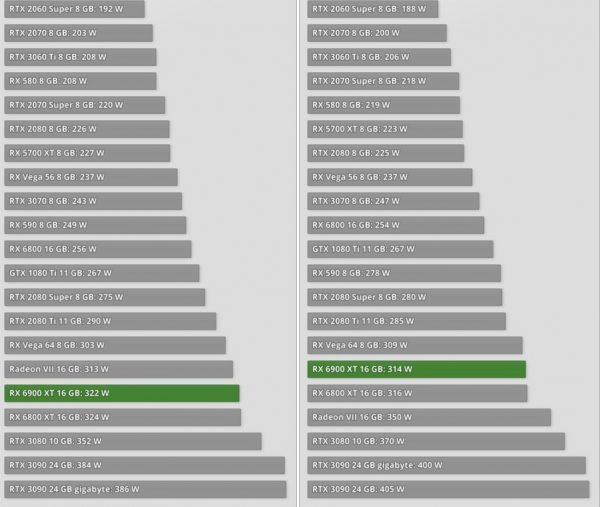O Hardware de Tom viu leituras de ruído e temperatura semelhantes. Os revisores observaram que ao usar o acelerador gráfico em jogos, o nível de seu consumo de energia, em média, na maioria dos casos ficou dentro dos 300 watts declarados pelo fabricante. No pico da carga de jogo, os jornalistas notaram o valor em 322 watts. Em testes sintéticos, o pico foi de 314 watts. Neste ponto, a placa de vídeo foi testada no Furmark. Um resultado muito decente para um carro-chefe, considerando que o modelo mais jovem Radeon RX 6800 XT mostrou consumo cerca de 3-4 W a mais sob as mesmas condições. Além disso, o nível de consumo de energia da Radeon RX 6900 XT não pode ser comparado com os resultados da GeForce RTX 3090. No mesmo Furmark, o valor de consumo de energia para o último foi de 405 W, e no pico de carga de jogo – 386 W.