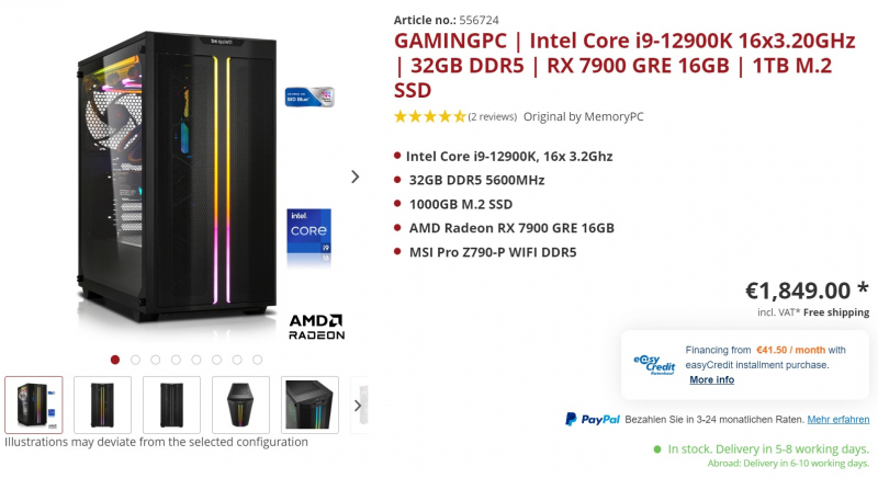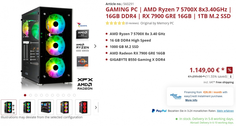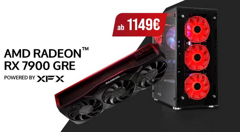 Um sistema baseado em AMD com uma placa de vídeo Radeon RX 7900 GRE custa € 1.149. Um PC baseado em Intel custava € 1.849 por um montador alemão. Um sistema Intel similar, mas equipado com uma placa de vídeo Radeon RX 7900 XT, é oferecido por €2099. Ou seja, a versão com RX 7900 GRE economiza 250€.