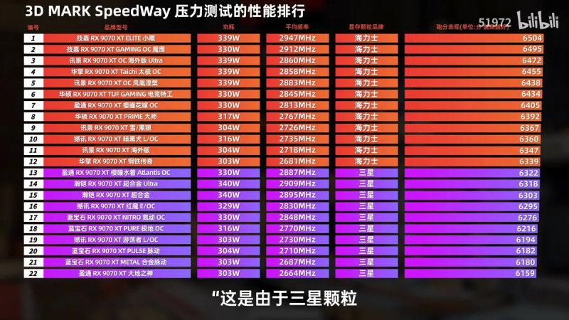Um entusiasta chinês com o pseudônimo 51972 publicou recentemente os resultados de um teste em larga escala de 22 versões de placas de vídeo Radeon RX 9070 XT equipadas com memória Samsung e SK Hynix na rede social Bilibili, comparando-as entre si. Os testes foram realizados no benchmark 3DMark Speed Way. Cada modelo de placa equipado com memória Samsung apresentou resultados 1-2% piores do que as variantes de placa com memória SK Hynix.