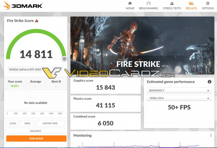 O portal VideoCardz compartilhou os resultados da verificação do desempenho da placa de vídeo GeForce RTX 3050 no teste gráfico 3DMark. Na disciplina 3DMark Time Spy, o novo produto da NVIDIA está pronto para oferecer desempenho 24% superior em comparação com a Radeon RX 6500 XT. Ao mesmo tempo, no teste FireStrike, a placa “verde” é apenas alguns por cento mais rápida que a solução AMD.