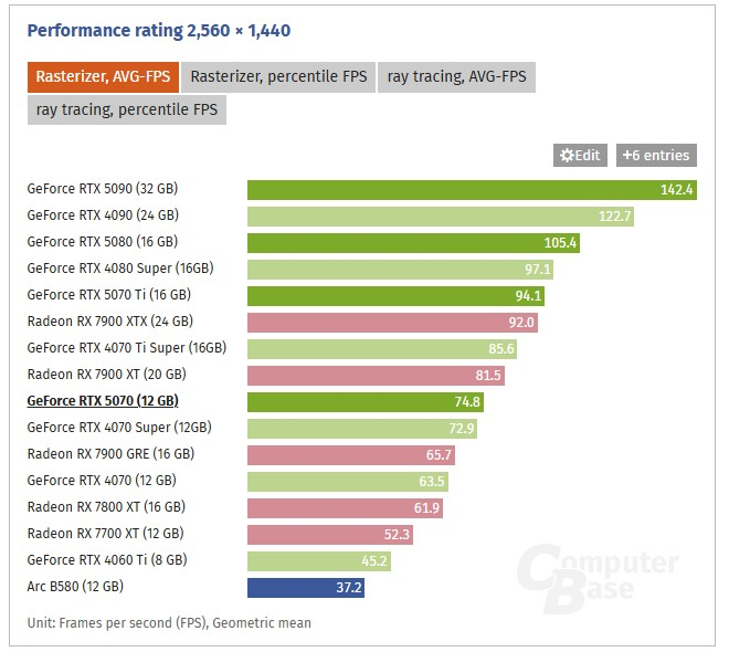 De acordo com a Computer Base, a GeForce RTX 5070 oferece desempenho bruto semelhante ao da GeForce RTX 4070 Super em resoluções de 1440p e 4K. O novo produto é apenas 4% mais rápido. A 1440p, a GeForce RTX 5070 é 15% mais rápida que a RTX 4070 normal, 12% mais rápida que a Radeon RX 7900 GRE, apenas 3% mais rápida que a GeForce RTX 4070 Super e 14% e 9% mais lenta que a GeForce RTX 4070 Ti Super e a Radeon RX 7900 XT, respectivamente.