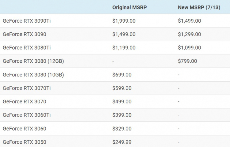 Segundo a fonte, a NVIDIA em breve reduzirá oficialmente os preços de três placas de vídeo mais antigas da família Ampere. Portanto, a principal GeForce RTX 3090 Ti cairá imediatamente de preço de US $ 500 a US $ 1499. A placa de vídeo GeForce RTX 3090 custará US$ 1.299 em vez dos US$ 1.499 anteriores, e o preço da GeForce RTX 3080 Ti cairá de US$ 1.199 para US$ 1.099. Além disso, a NVIDIA finalmente anunciará o preço recomendado da versão GeForce RTX 3080 com 12 GB de memória – US$ 799. O resto dos modelos ainda não são baratos.