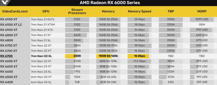 O portal francês informa que a Radeon RX 6700 será baseada no processador Navi 22 XL com 36 unidades de computação, que incluirá 2308 processadores stream. A Radeon RX 6700M móvel tem exatamente o mesmo conjunto de processadores de fluxo. De acordo com a Cowcotland, a placa de vídeo Radeon RX 6700 terá uma frequência de jogos de 2330 MHz e um máximo de 2495 MHz.