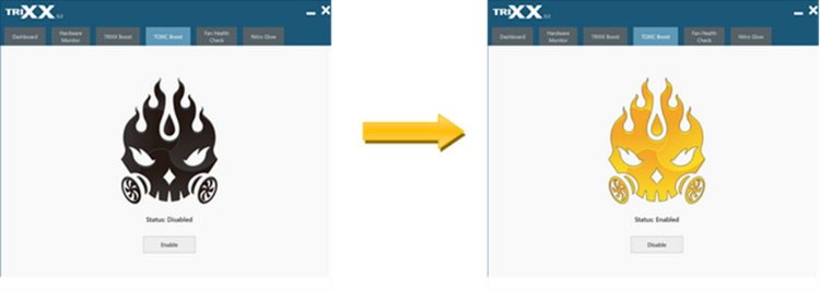 O fabricante recomenda usar o aplicativo TrixX Branded Software que permite pressionar o modo modular da placa de vídeo pressionando um botão.