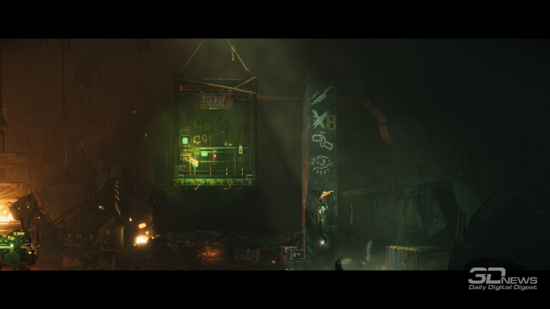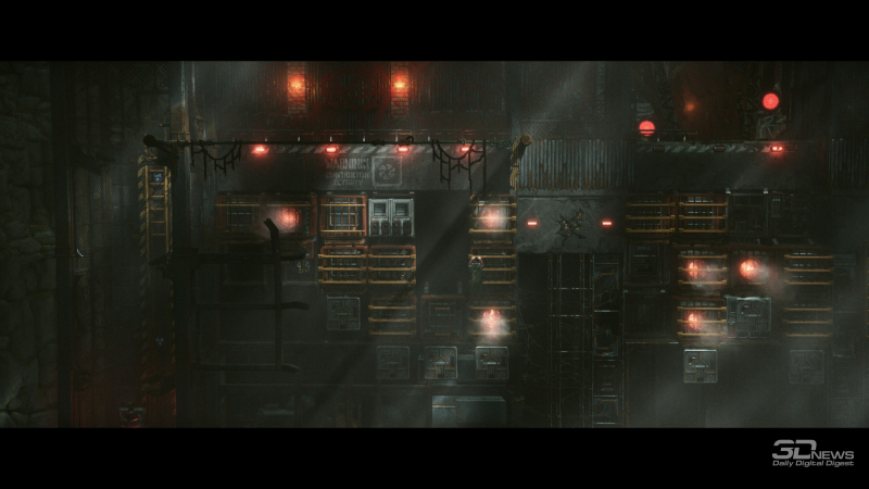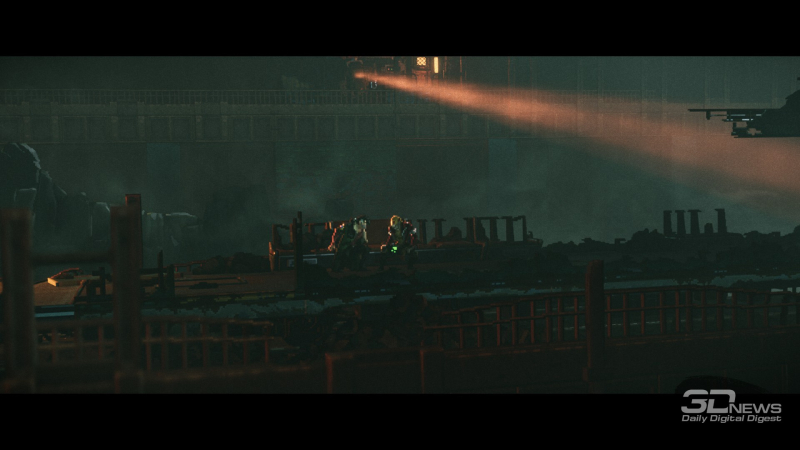 A narrativa visual em REPLACED é excepcionalmente alta no geral, graças à direção segura e à marcante composição das cenas, bem como aos gráficos detalhados. O primeiro plano e o plano de fundo são meticulosamente elaborados, permitindo que você passe um tempo examinando cada cena, percebendo os mínimos detalhes, que adicionam volume e profundidade à ação na tela — os visuais realmente dão vida ao mundo. Combinados com o efeito de paralaxe perfeitamente ajustado e as mudanças dinâmicas de perspectiva entre locais ou seções das zonas de jogo, até mesmo as cenas mais simples parecem verdadeiramente cinematográficas e espetaculares.