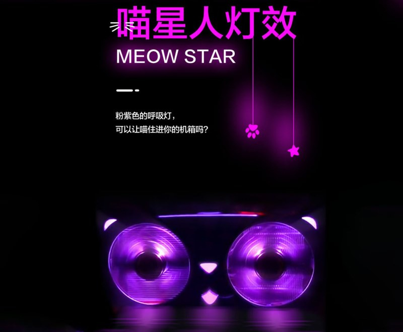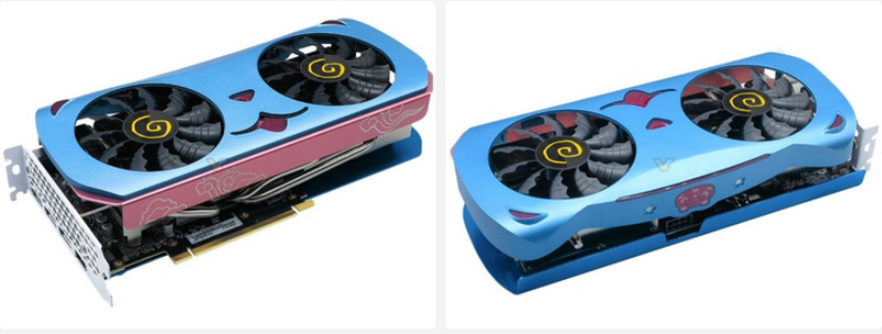 Quanto à aparência, a placa de vídeo é feita nas cores azul e rosa, e a superfície lateral do case lembra um gato engraçado (embora alguém veja nisso a cara de um urso). O design traz um sistema de iluminação Meow Star que ilumina a área atrás dos ventiladores com luz rosa, fazendo com que os olhos, orelhas, nariz e boca do animal brilhem.