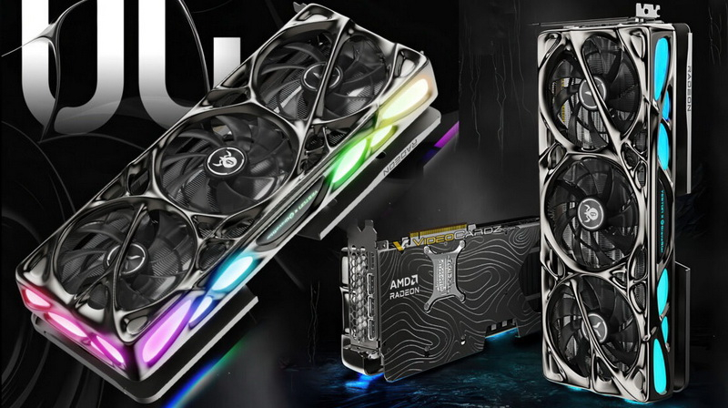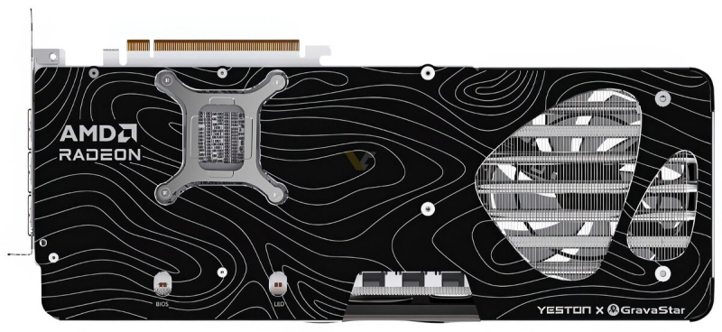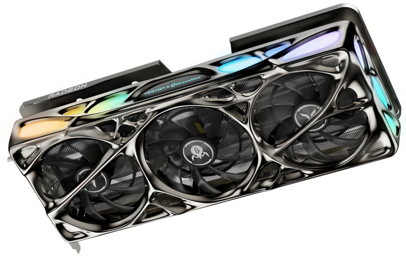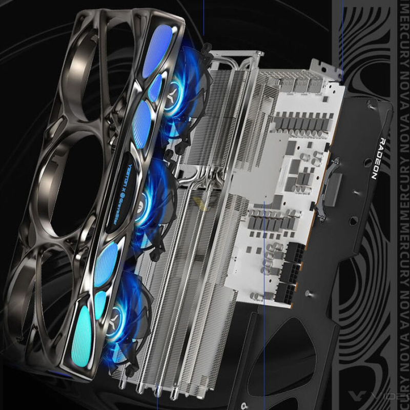 A Yeston Radeon RX 9070 XT Mercury Nova possui um sistema de resfriamento de três slots que inclui três ventoinhas de 93 mm, uma câmara de evaporação e uma cobertura aberta. A aparência do novo produto lembra vagamente as placas de vídeo EVGA GeForce GTX 1080 da era Kingpin.