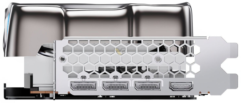 As bordas superior e lateral da placa são equipadas com iluminação ARGB. Outro recurso interessante é a placa de circuito impresso branca com três conectores de 8 pinos para alimentação adicional. Placas brancas são raras em placas de vídeo, especialmente em combinação com um sistema de resfriamento preto. Embora no caso da Mercury Nova estejamos falando mais de um design preto brilhante.