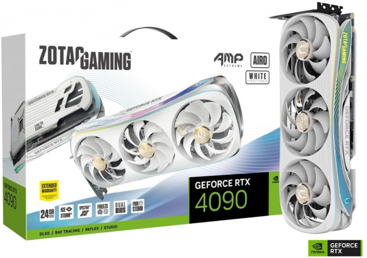 GeForce RTX 4090 e RTX 4080 AMP Extreme AIRO White Edition da Zotac têm exatamente as mesmas especificações técnicas, como o original versão AIRO. Diferença é apenas aparência. Você placas de vídeo na versão White Edition coberturas do sistema de arrefecimento e traseiras de intensificação placas têm cor branco.