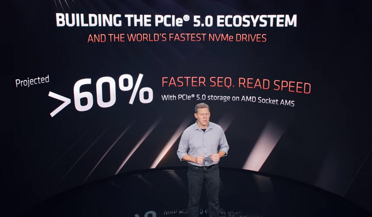 Falando na abertura da Computex 2022, os representantes da AMD enfatizaram que a plataforma Socket AM5, usando os chipsets que a acompanham, suporta a interface PCI Express 5.0 para conectar unidades de estado sólido, para que os compradores dos sistemas correspondentes possam experimentar um aumento de desempenho de até para 60% em operações de leitura sequencial.