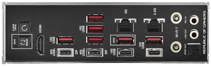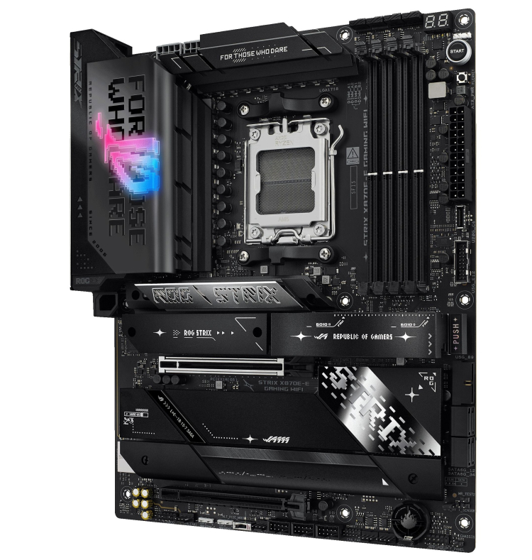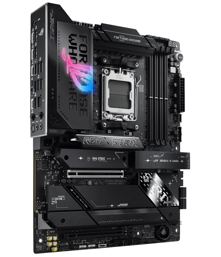 O modelo ROG Strix X870E-E Gaming WIFI suporta Wi-Fi 7 e está equipado com um conector LAN de 5 Gigabit. O som da novidade é fornecido pelo codec ROG SupremeFX ALC4080 com amplificador Savitech SV3H712. Os conectores disponíveis incluem dois USB4 (USB Tipo C 40 Gbps), um USB Tipo C 20 Gbps com carregamento rápido de 30 W, dez USB 10 Gbps (nove Tipo A e um USB Tipo C), um USB Tipo C 20 Gbps, dois USB frontais de 5 Gbps e três USB 2.0 frontais. A placa também é equipada com mecanismos para instalação rápida de drives NVMe e placa de vídeo.