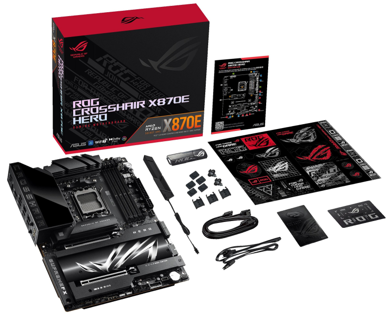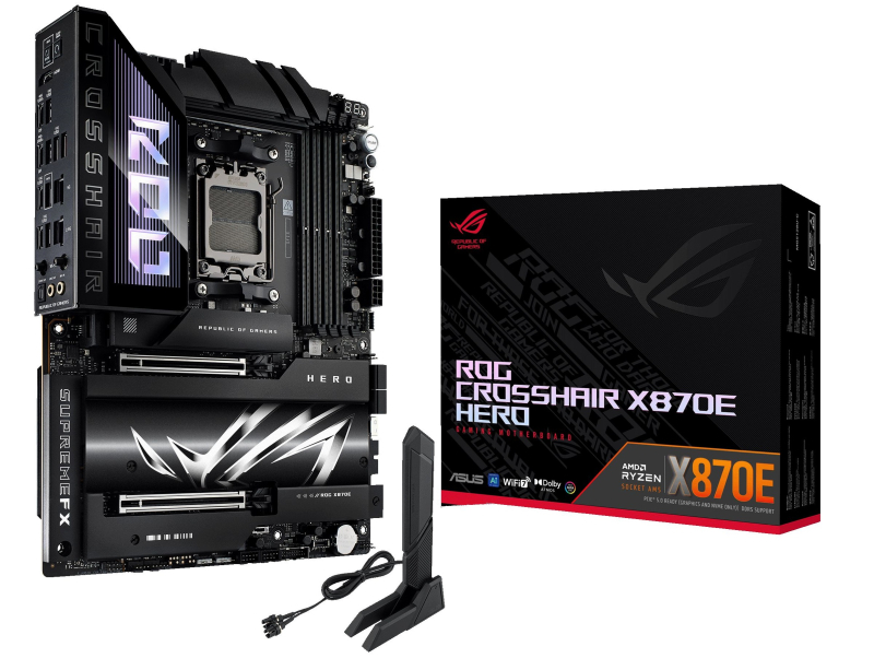 Entre os modelos de placas-mãe apresentados pela Asus estava o carro-chefe ROG Crosshair X870E Hero. Ele usa um subsistema de alimentação VRM de 22 fases com um padrão de 18+2+2 fases. O novo produto é equipado com quatro slots DIMM que suportam instalação de até 192 GB de RAM DDR5, dois PCIe 5.0 x16, três M.2 2280 (PCIe 5.0 x4) e dois M.2 2280 (PCIe 4.0 x4) e uma interface SlimSAS (PCIe4.0x4).