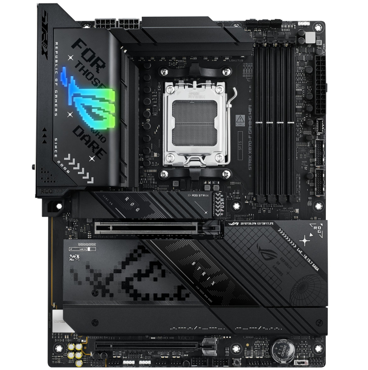 Uma classificação inferior é o modelo de placa WIFI para jogos ROG Strix X870E-E. Também é baseado em um subsistema de alimentação VRM de 22 fases com um diagrama de fases de 18+2+2. A placa está equipada com quatro slots DIMM que suportam a instalação de até 192 GB de RAM DDR5, um PCIe 5.0 x16, um PCIe 4.0 x4. Recebeu um M.2 22110 (PCIe 5.0 x4), bem como dois M.2 2280 (PCIe 5.0 x4) e M.2 2280 (PCIe 4.0 x4).