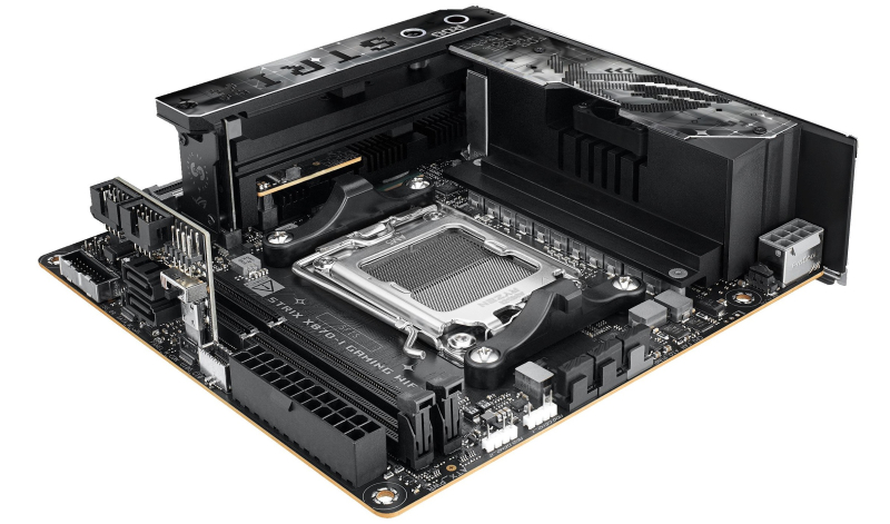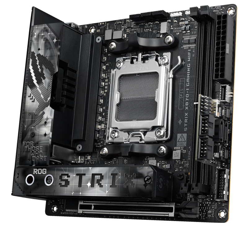 Ao contrário de todas as placas apresentadas, o modelo ROG Strix X870-I Gaming WiFi é feito no formato Mini-ITX. Ele segue as recomendações da Nvidia SFF e foi projetado para construir sistemas de jogos compactos. A placa recebeu dois slots DIMM com suporte para até 96 GB de RAM DDR5.
